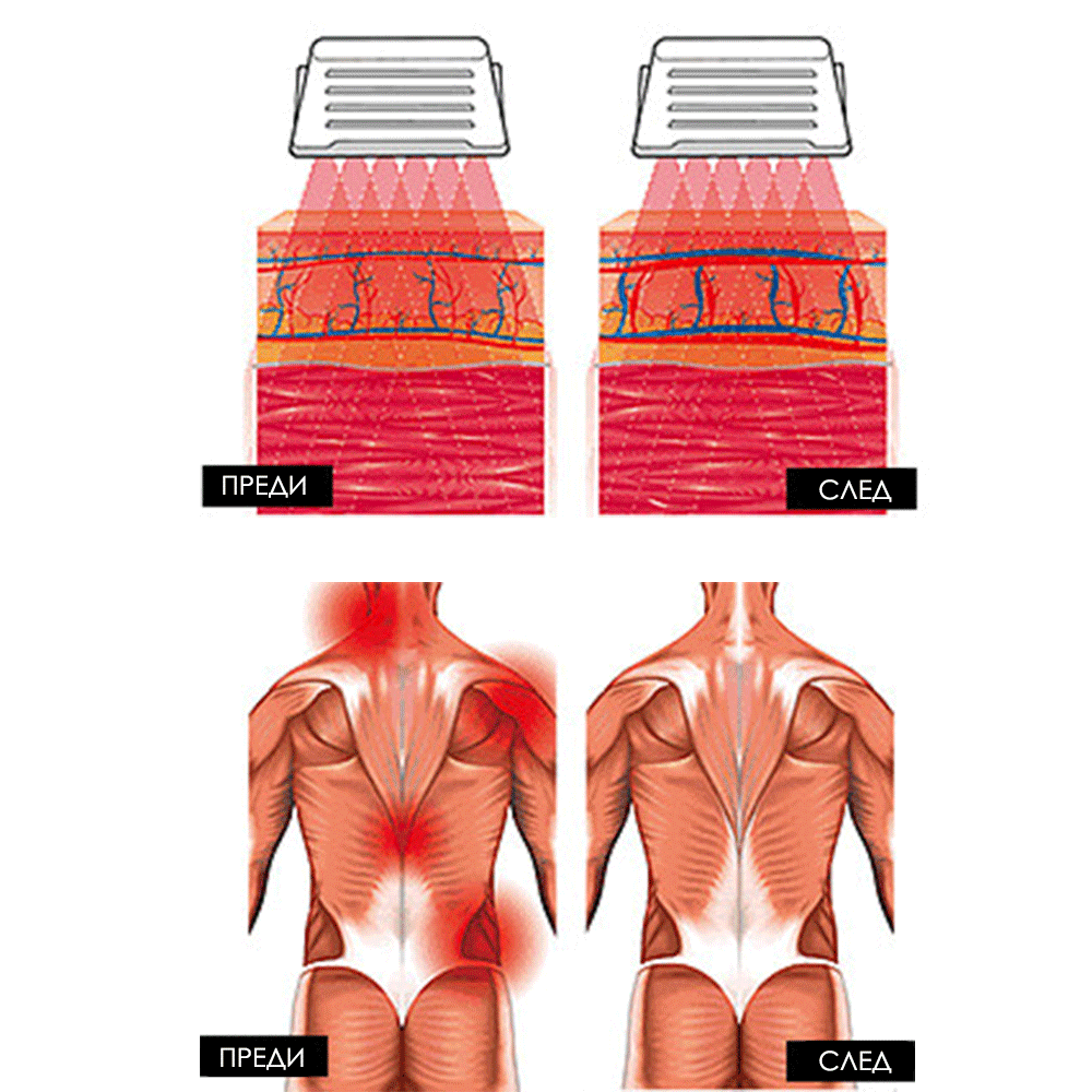 За облекчение на дискомфорта в мускули и стави се използва 830nm дълбокопроникваща инфрачервена светлина, която фотостимулира дермалнатa микроциркулация в кожните клетки. Вградената технологията за фотосеквенция извършва предварителна микросветлинна подготовка на кожата с 590nm, за да подобри резултатите.