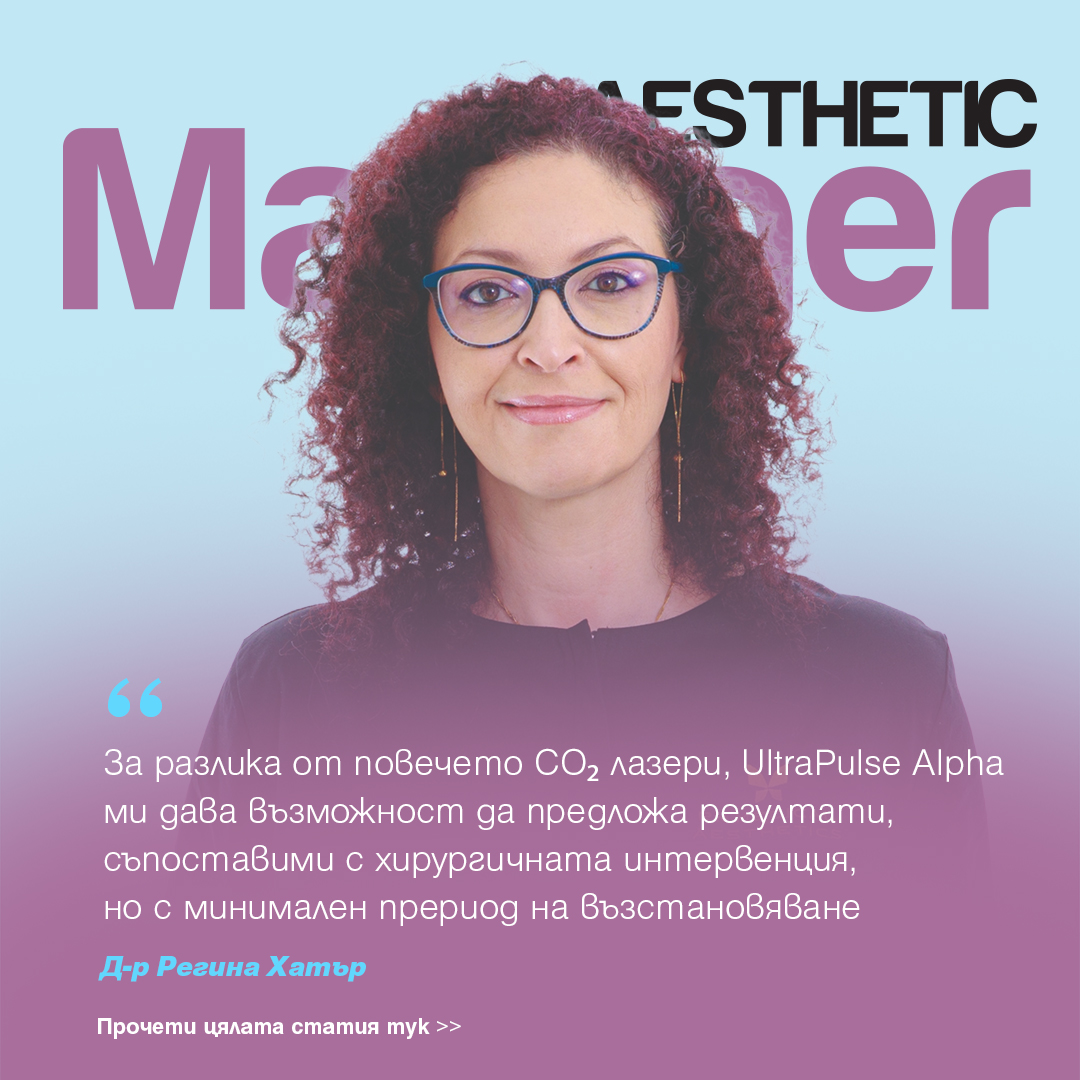 Д-р Регина Хатър, дм е специалист по пластично-възстановителна и естетична хирургия с международна акредитация от Европейския борд (EBOPRAS) и Френския колеж по пластична хирургия – C.F.C.P.R.E. Тя е председател на Българската асоциация по пластична, реконструктивна и естетична хирургия от 2022 г. и притежава докторска степен с дисертация в областта на регенеративната хирургия (липофилинг). Д-р Хатър е първият лекар у нас с клиничен опит с високотехнологичната фракционирана CO2 лазерна система UltraPulse Alpha, създадена от световния лидер в медицинските лазери Lumenis. Това е една от най-мощните и прецизни лазерни технологии на пазара, използвана широко в естетичната, дерматологичната и реконструктивната медицина за третиране на белези, бръчки, фотостареене и цялостно ремоделиране на кожата. Системата стимулира мощна регенерация със значително по-кратко възстановяване, благодарение на множество фракционни режими, при които се обработват само микроучастъци от кожата, оставяйки съседната тъкан непокътната. Сред тях е и режим за третиране на дълбоки и плътни лезии с проникване до 4 мм в дълбочина. Изключително кратката продължителност на импулса свежда до минимум термичното увреждане и ускорява заздравяването.