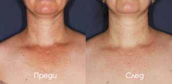 43-годишна пациентка с кожа тип III по скалата на Фицпатрик посети нашата клиника с добре поддържано качество на кожата на лицето, но със значителни лезии по деколтето в резултат на фотоувреждане поради недостатъчна слънцезащита.