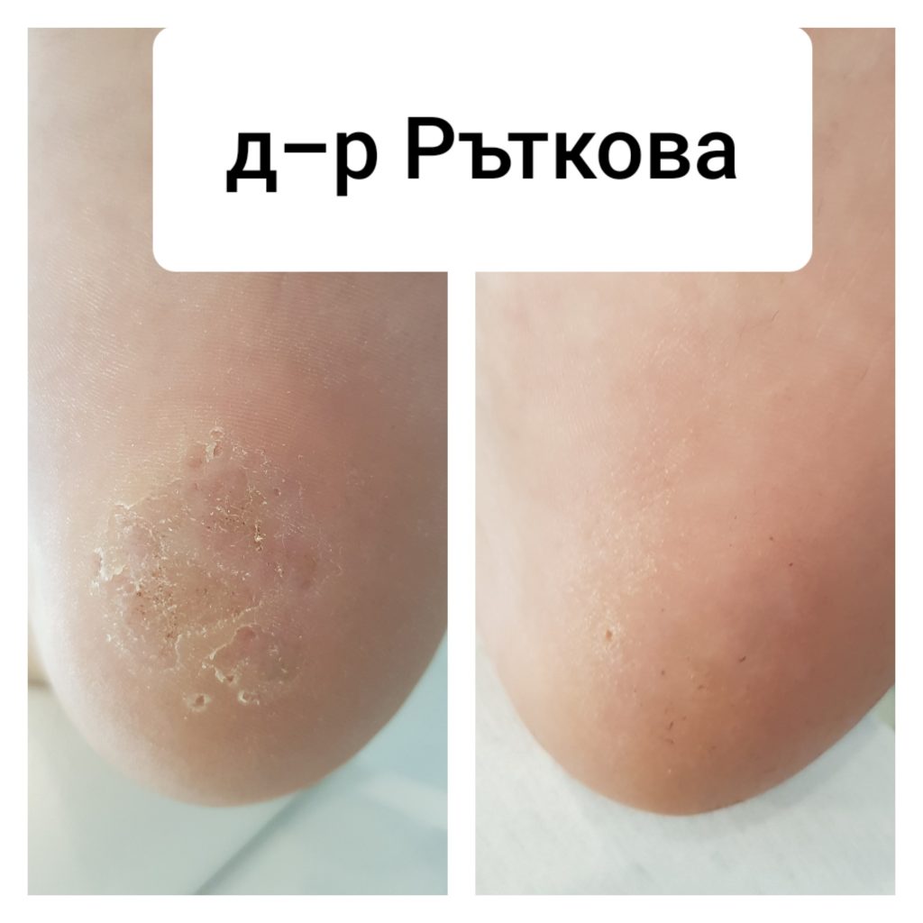 Едни от най-резистентните на терапия вирусни брадавици са плантарните веруки. Кожата там е подложена на постоянна механична травма от ходенето от една страна, от друга дебелината на роговия слой е по-голяма в сравнение с други зони от човешкото тяло. Случаят ми е с момче на 22 години, което от дълго време се бори с вирозата чрез многократно третиране с криотерапия, локална кератолитична терапия с продукти, съдържащи урея, кюретиране. Резултатът, който постигнахме само с една сесия с Vbeam Perfecta беше изключително удовлетворяващ както за мен, така и за пациента, който вече не изпитва болки при ходене и може отново да спортува. Скоро предстои следваща среща, при която ще се прецизира необходимостта от продължаване на терапията.